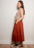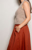 The Dalston Sapphire Skirt in vibrant rust is a midi-length style with a wide comfortable elastic waistband and front side pockets. Its flattering front pleats are designed to lie smoothly across the tummy and subtly to the sides. A seasonal offering the Sapphire Skirt is the skirt you will wear on repeat.