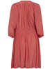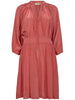 The Saria dress in faded rose from Mos Mosh is effortlessly romantic, a flowy dress giving bohemian vibes. Designed in a relaxed fit, it features a V-neckline adorned with delicate tape details that enhance its feminine charm. The gathered waist and intricate lace accents create a flattering silhouette, while the smocked back adds definition and highlights the soft pleats for a beautifully draped effect. Voluminous 3/4-length sleeves add a whimsical touch, complemented by tassel ties at the neckline for an extra dose of free-spirited charm. Style it with strappy sandals for a breezy summer look or pair it with tall leather boots for a more dramatic, boho-inspired statement.