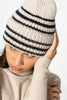 The Dinadi Handknit Striped hat in almond white is a rib knitted hat with stripes and a unique decrease detail on top. Hand knitted in extra fine merino wool.