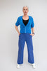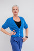 Audrey is a gorgeous cropped v neck short sleeve cardi in clearest bluebell colour. She has 5 pearly buttons and is hand knitted in a lacy stitch. Perfect for Spring layering.