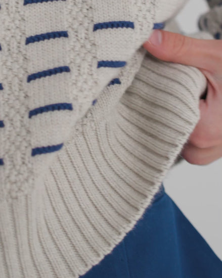 A boxy knit with a slight drop shoulder and thick ribbing at the neck, cuffs and hem. Crafted in organic cotton, the Thread Jumper features a subtle blue accent stripe and vertical textured knit. A soft, relaxed layer in a natural Oat Melange.