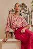 The Palmarosa print, in delicate shades of blush pink and coral, features intricate botanical motifs that bring a sense of refined artistry to your wardrobe. A keyhole neckline with a subtle loop detail adds a modern touch, while the softly gathered sleeves and elastic cuffs create gentle volume for a flattering silhouette.